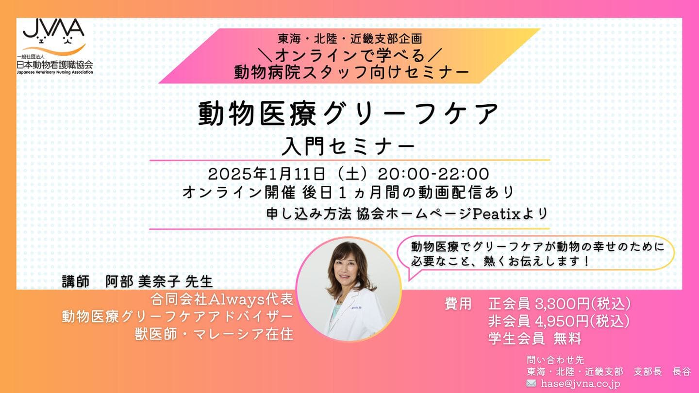 今回のセミナーでは動物医療グリーフケアを解説し正しい理解を広げます。また、動物病院から3症例発表、プロフェッショナルグリーフに対するグリーフケアを解説します。