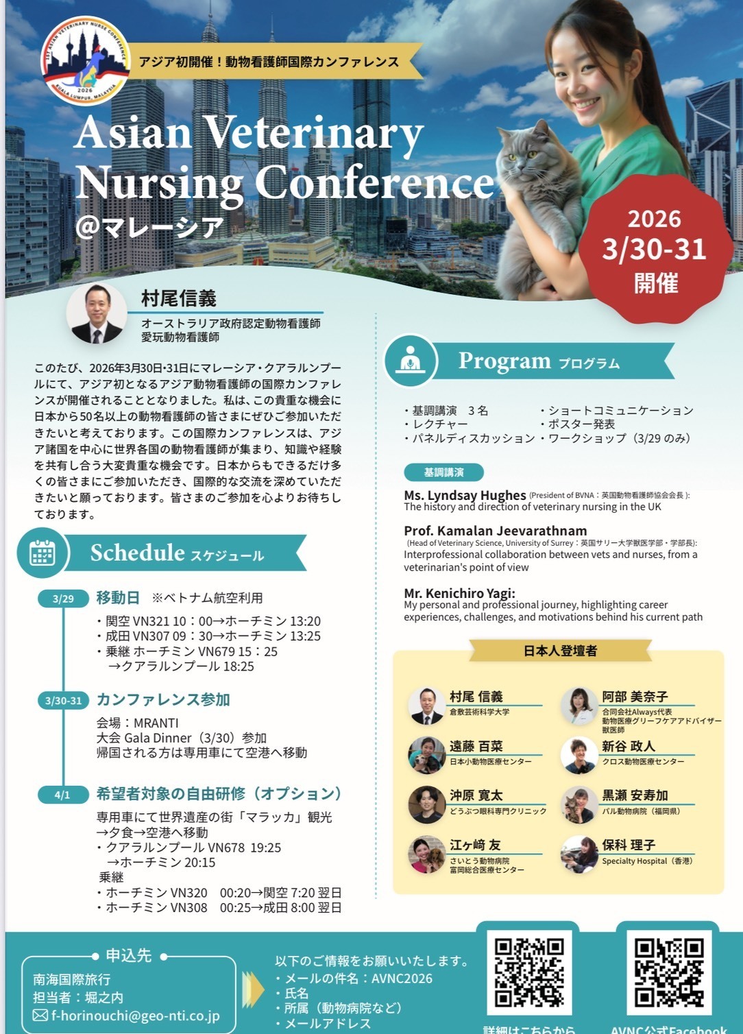 アジアの動物医療の熱気が高まっている今日、アジアの動物看護師と交流するチャンス。さまざまな視点が広がるアジア大会に日本から参加してみませんか。