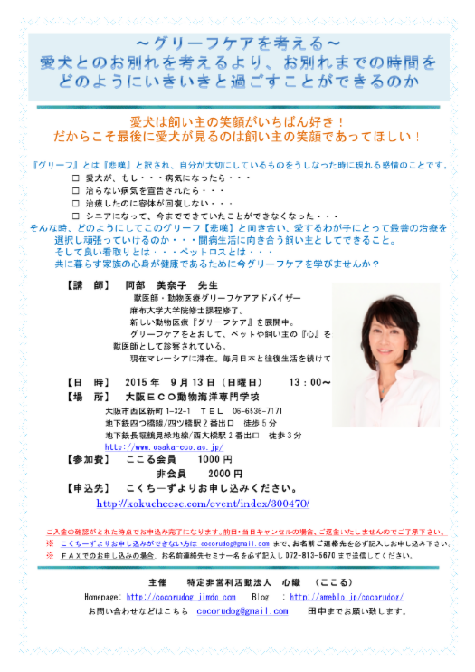 9月13日 | どのようにしてこのグリーフ【悲嘆】と向き合い、愛するわが子にとって最善の治療を選択し頑張っていけるのか・・・ 闘病生活に向き合う飼い主としてできること。 そして良い看取りとは・・・ペットロスとは・・・ 共に暮らす家族の心身が健康であるために今グリーフケアを学びませんか? |