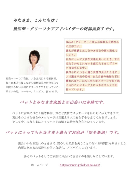 | 講師 | 阿部 美奈子 先生 獣医師・グリーフケアアドバイザー |