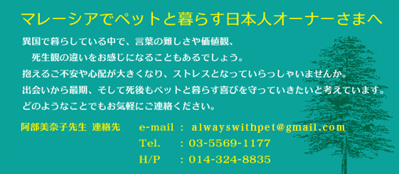 2014年もマレーシアと日本を往復しながら活動していきます! | 毎月マレーシアと日本を往復しながらグリーフケアアドバイザーとしての 活動を成し遂げることができ、心より感謝しています。 今年も遠距離通勤を続けながら、グリーフケアを実施して参ります。 人にとって、ペットの存在感がますます大きくなり続ける今日。 大切なペットにとって「安全な」環境作りを目指し、さまざまな角度から グリーフケアを実施していきたいと思っています。 今年もどうぞよろしくお願いいたします。 |