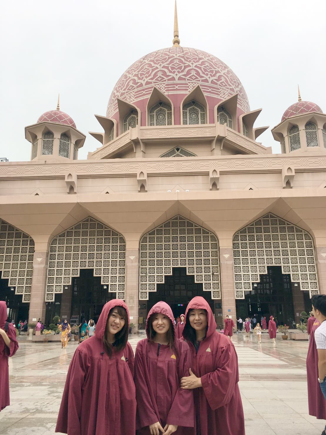 イスラム教の人々が集うモスクではスカーフとガウンを貸し出され中へ。