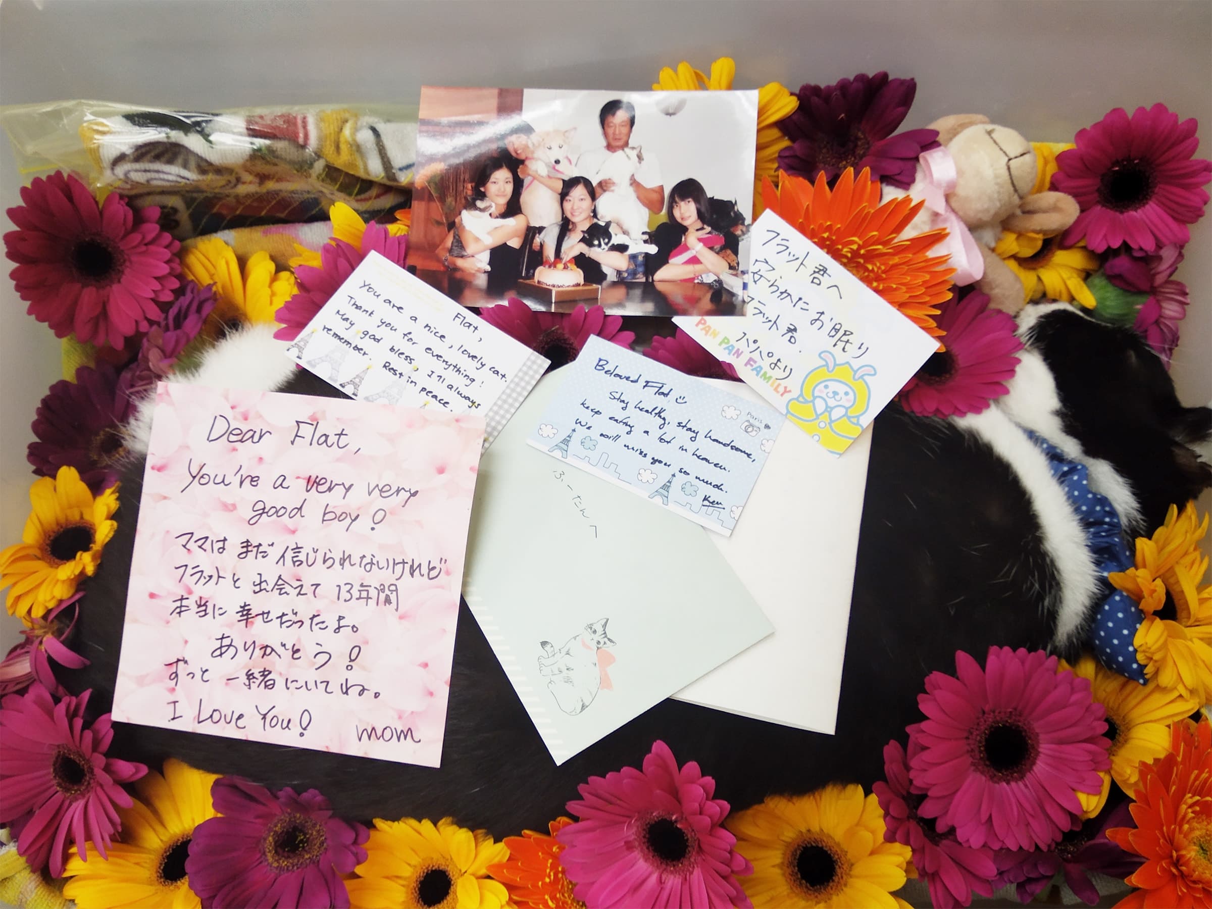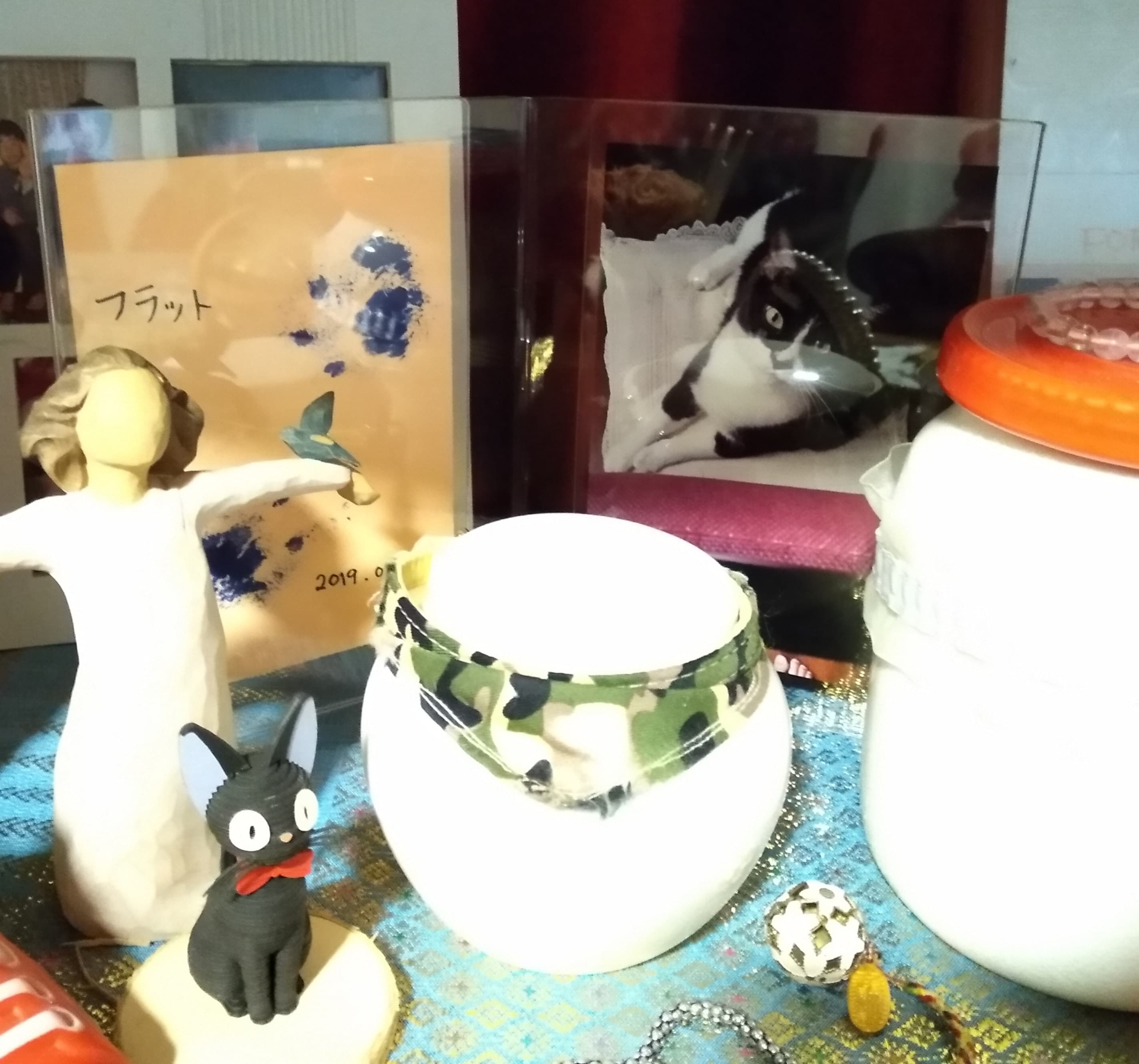 メッセージや写真とともに。フラットの入った小さな骨壺は5年間亡くなったリズムのとなりに安置しています。