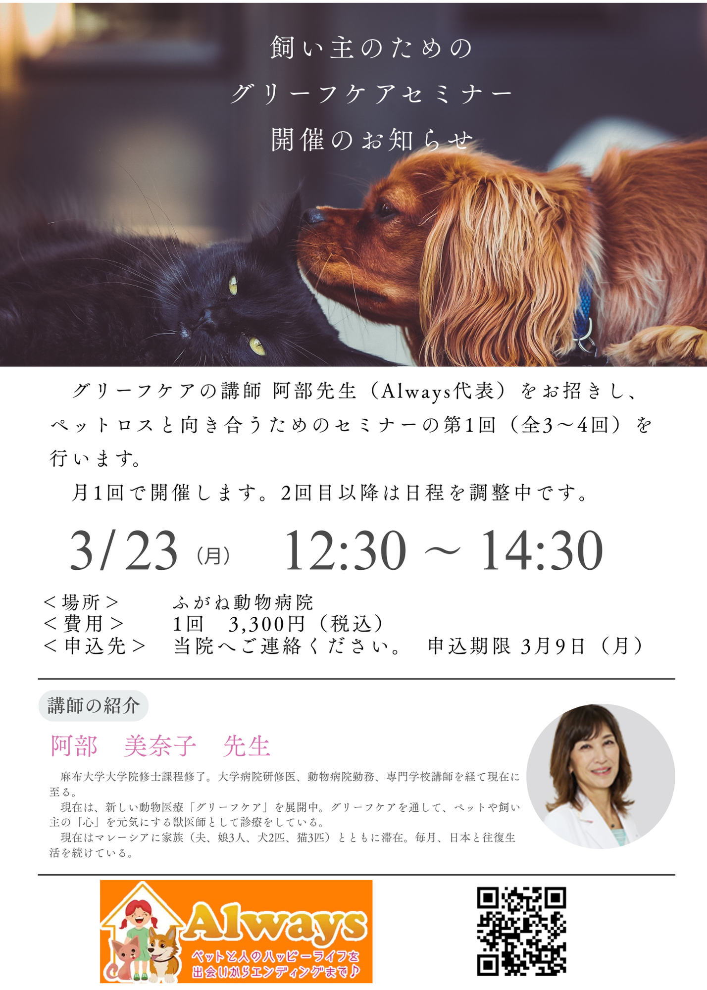 阿部美奈子先生(Always代表)による、ペットロスと向き合うためのセミナー第1回目を開催します。