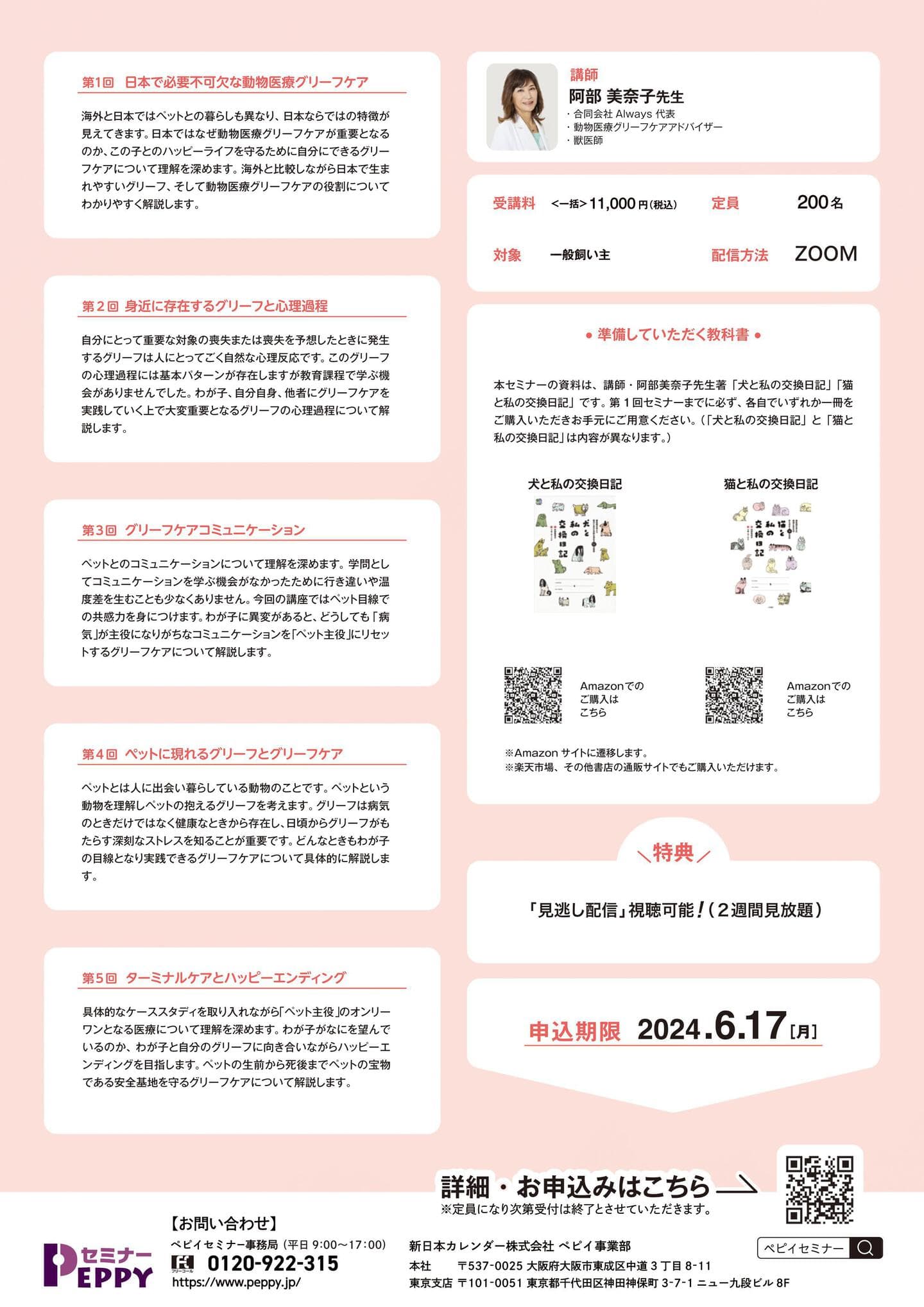 ペットの一番の味方はその子と出会えたあなたです。ペットと出会えた幸運をお守りにしながら、身近なグリーフに寄り添いハッピーライフを守りましょう。第3期となる今回は、新たに「ペットロスと命のバトンタッチ」のテーマを加え、各論6回を通して動物医療グリーフケアの基本を学んでいただきます。まずはわが子へ、自分へ、そして次には周囲へと動物医療グリーフケアを実践していく人材が必要です。講座で共に学ぶ仲間と一緒に動物医療グリーフケアの大きな輪を広げませんか?